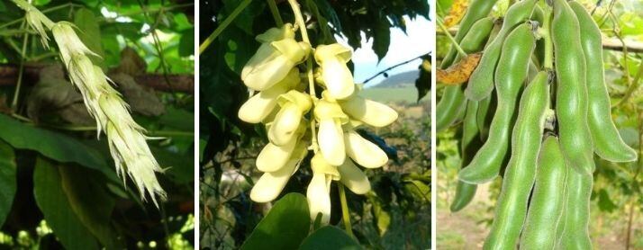 つるが伸びて成長した頃に花芽が付きます。そして花が咲き大きな枝豆のようなサヤがたくさんつきます。