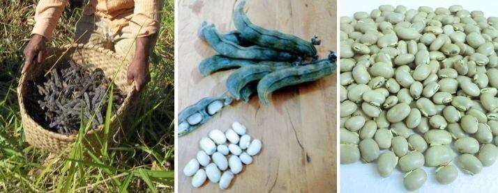 一方、成長が遅いムクナは気候が合わない土地では嵐や霜害などで未熟なままになり、サヤごと腐ったりします。なんとかそれを免れても豆が貧弱だったり、変色しシミなどが残って良い品質が確保できない場合があります。(右端のブラジル産の完熟豆と比較すると良く分かります。)