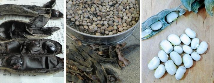 完熟して乾燥したサヤを収穫してから天日でさらに干して中の豆を取り出します。完熟なのでまるまると良く肥ったきれいなグレーです。